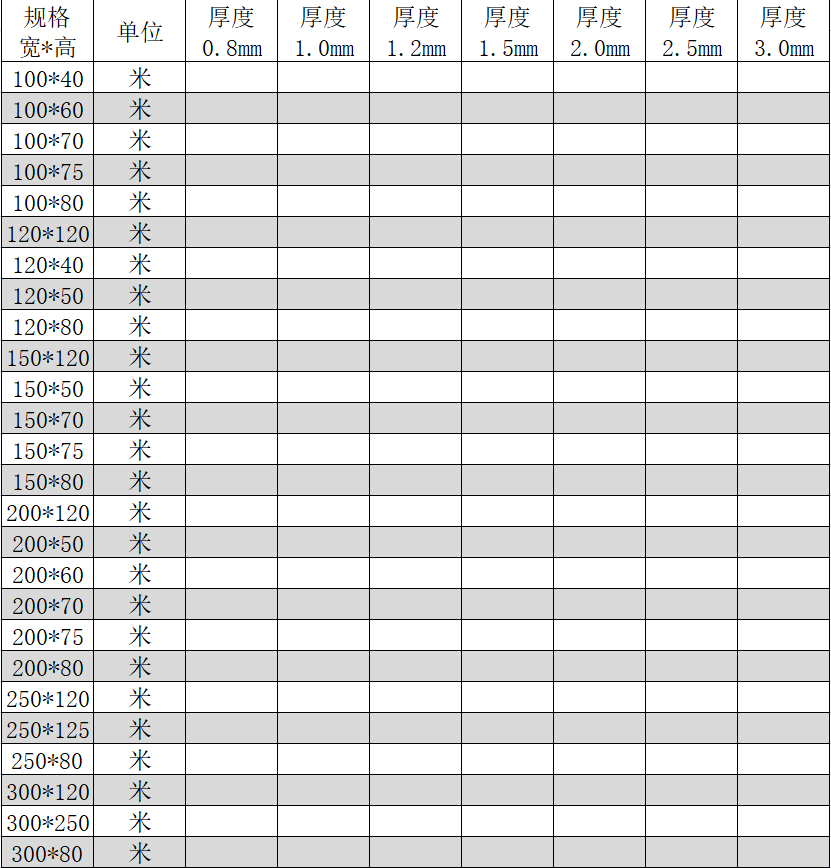 备注:由于规格多,未能全部列出,以上为部分常用规格单价,根据要求特殊尺寸可制作。